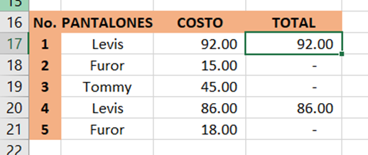 los valores mayores que 5. Puede usar la siguiente fórmula: =SUMAR.SI(B17,"Levis",C17)